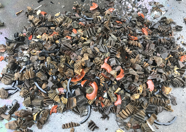 濾油器通過四軸撕碎機(jī)進(jìn)行初級破碎,破碎成60mm塊狀,通過震動篩,使出料的成品均勻到下個(gè)工段,同時(shí)把里面的油震出來。經(jīng)磁選機(jī)將物料中的鐵跟紙分離,廢鐵通過錘式破碎機(jī)破碎成小的球狀,再清洗烘干變成純干鐵,油紙則經(jīng)過脫油變成干紙。